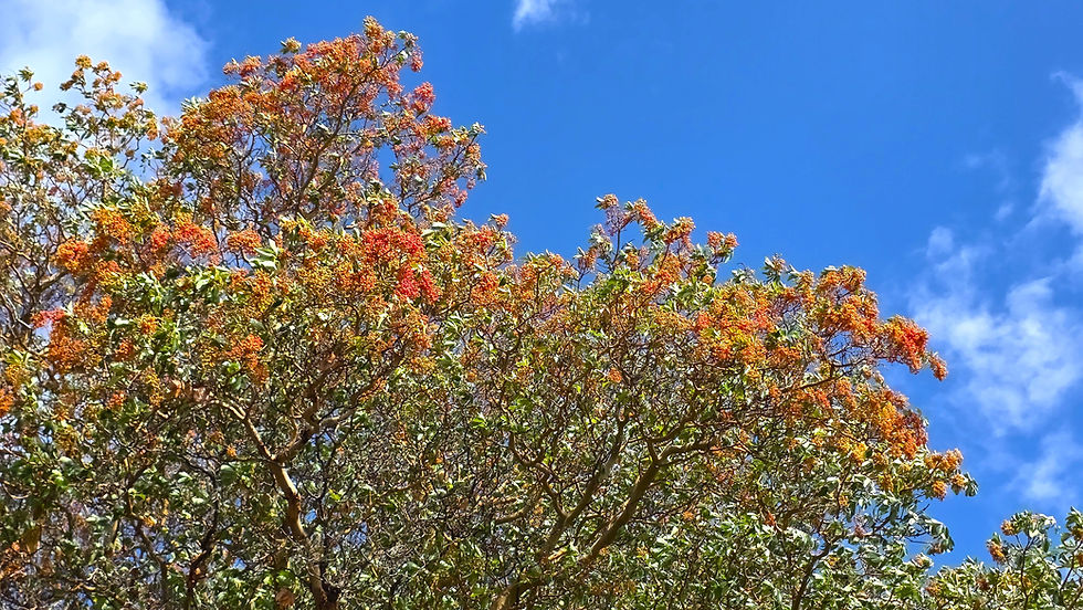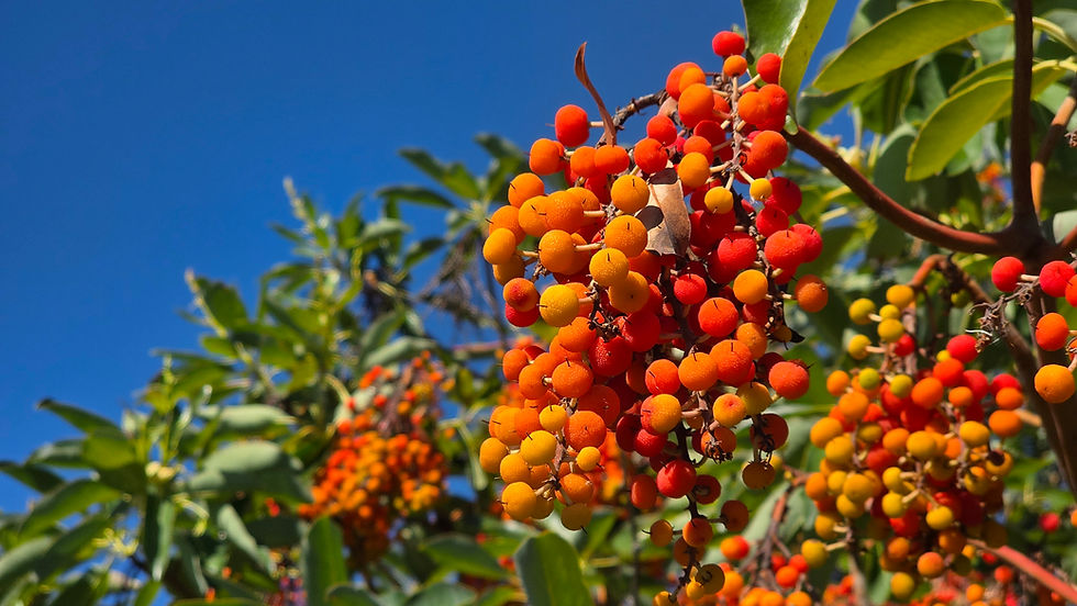 This tree brightens dark days with its glowing bark of bright orange and shimmering evergreen leaves. Right now, its Christmas-red berries stand out against autumn hillsides, feeding wildlife at a time they need it most. And come spring, it will awaken our hillsides with bouquets of brilliant white flowers.